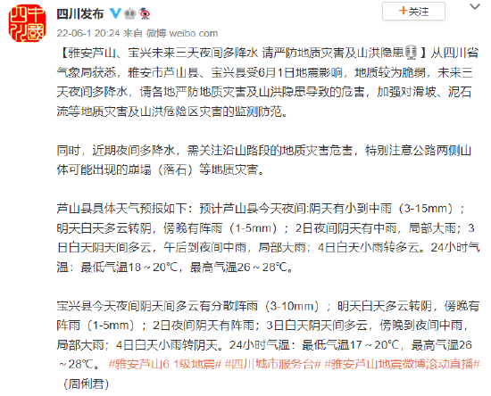 [雅安芦山、宝兴未来三天夜间多降水 请严防地质灾害及山洪隐患[话筒]]从四川省气象局获悉,雅安市芦山县、宝兴县受6月1日地震影响,地质较为脆弱,未来三天夜间多降水,请各地严防地质灾害及山洪隐患导致的危害,加强对滑坡、泥石流等地质灾害及山洪危险区灾害的监测防范。