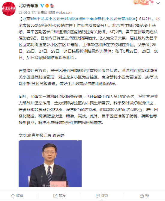 [北京#昌平龙乡小区划为封控区# #昌平南店新村小区划为管控区#]6月2日,北京市第353场新冠肺炎疫情防控工作新闻发布会召开。北京青年报记者从会上获悉,昌平区副区长白琳通报该区疫情防控有关情况。6月2日,昌平区新增无症状感染者2名,目前均已转至定点医院隔离治疗。2人为父子关系,居住地均为昌平区回龙观街道龙乡小区东区12号楼,工作单位和所在学校均在外区,父亲5月25日、26日、27日、29日、31日核酸检测结果均为阴性;孩子5月27日、29日、30日、31日核酸检测结果均为阴性。