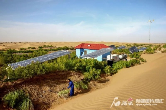 一位工人在安装光伏发电板。图由塔里木油田提供