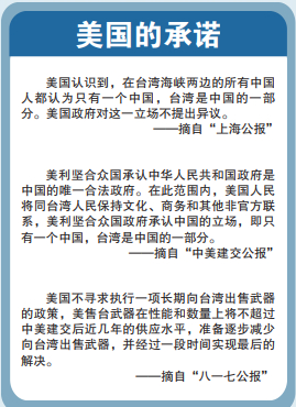 今年是美国前总统尼克松访华和“上海公报”发表50周年。经过艰苦谈判的“上海公报”申明中方坚决反对任何旨在制造“一中一台”“一个中国、两个政府”“两个中国”“台湾独立”和鼓吹“台湾地位未定”论的活动。美方认识到,在台湾海峡两边的所有中国人都认为只有一个中国,台湾是中国的一部分。美国政府对这一立场不提出异议,重申对由中国人自己和平解决台湾问题的关心。考虑到这一前景, 美国确认从台湾撤出全部美国武装力量和军事设施的最终目标。在此期间,美国将随着这个地区紧张局势的缓和逐步减少它在台湾的武装力量和军事设施。