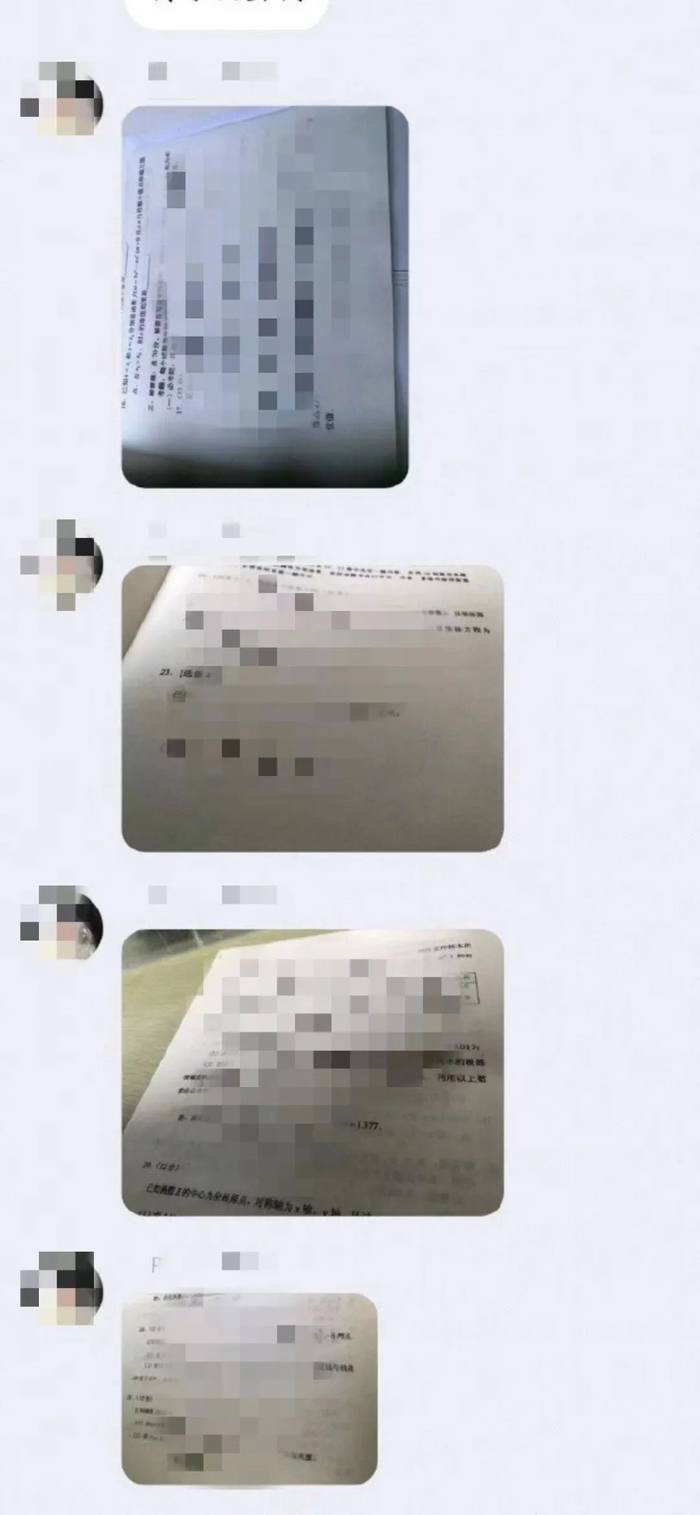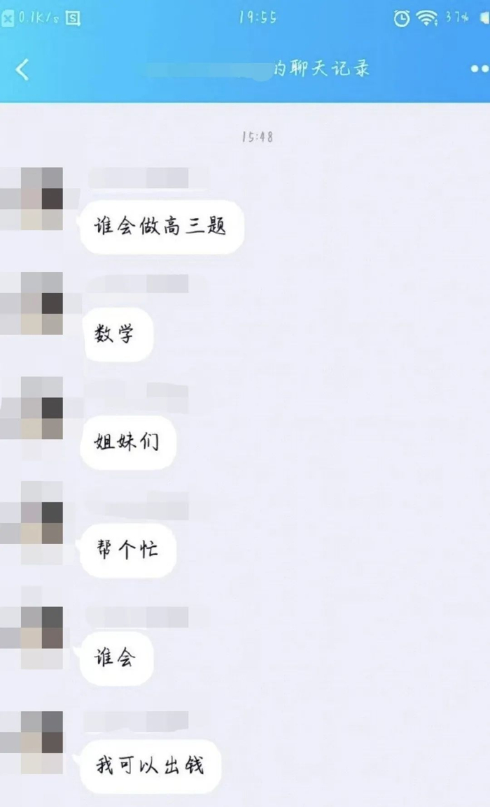 6月7日,有网友爆出多张QQ聊天截图,截图显示,一名昵称为pursue张瑞瑞的网友在群内发布求助信息:“谁会做高三题 数学 帮个忙 我可以出钱……”并附上多张疑似试卷数学题目的照片。记者注意到,该网友最初在群内发布信息的时间为15:48分。随后该网友在群内称:“我也是人给我发的,人家价格高啊,一道题给我两千。”
