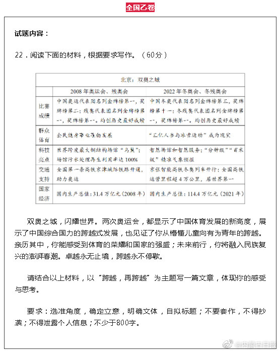 双奥之城,闪耀世界。两次奥运会,都显示了中国体育发展的新高度,请结合以上材料,以“跨越,再跨越”为主题写一篇文章,体现你的感受与思考。(全国乙卷地区:河南、山西、江西、安徽、甘肃、青海、内蒙古、黑龙江、吉林、宁夏、新疆、陕西)