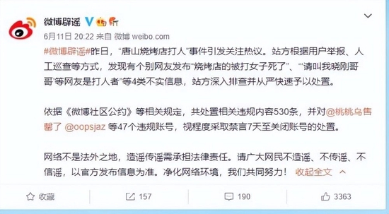 此外,在6月11日,微博辟谣官方账号就曾发布过辟谣博文,表示站方根据用户举报、人工巡查等方式,发现有个别网友发布“烧烤店的被打女子死了”、“‘请叫我晓刚哥哥’等网友是打人者”等4类不实信息,站方深入排查并从严快速予以处置。