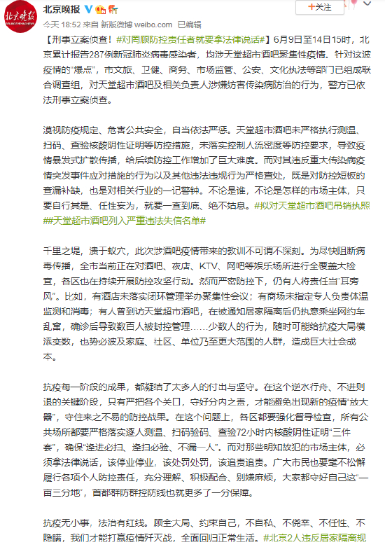 6月9日至14日15时,北京累计报告287例新冠肺炎病毒感染者,均涉天堂超市酒吧聚集性疫情。针对这波疫情的“爆点”,市文旅、卫健、商务、市场监管、公安、文化执法等部门已组成联合调查组,对天堂超市酒吧及相关负责人涉嫌妨害传染病防治的行为,警方已依法刑事立案侦查。