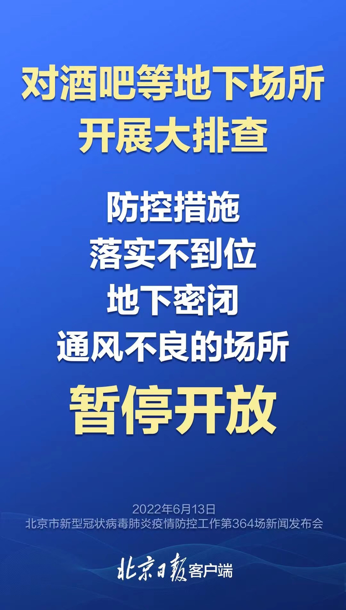 据昨天的北京市疫情防控发布会介绍,截至6月13日15时,涉天堂超市酒吧聚集性疫情累计报告228例感染者,涉及14个区和经开区的100个街乡。北京正对酒吧等地下场所开展大排查,举一反三,抓好整改,对防控措施落实不到位、地下密闭通风不良的场所暂停开放。目前,海淀区歌舞娱乐、网吧、演出游艺、剧本杀、密室逃脱等场所278家已全部暂停营业;此前,朝阳区各歌舞娱乐场所、网吧已暂停营业。