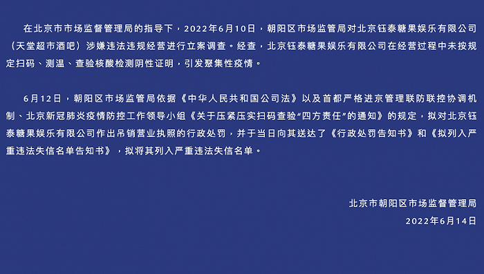 “北京朝阳市场监管”微信公众号6月14日消息,在北京市市场监督管理局的指导下,2022年6月10日,朝阳区市场监管局对北京钰泰糖果娱乐有限公司(天堂超市酒吧)涉嫌违法违规经营进行立案调查。经查,北京钰泰糖果娱乐有限公司在经营过程中未按规定扫码、测温、查验核酸检测阴性证明,引发聚集性疫情。