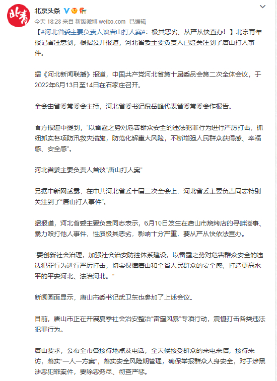 河北省委主要负责人谈唐山打人案:极其恶劣、从严从快查办!