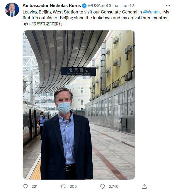 出发前,伯恩斯在推特发出了一张在北京西站的月台等候列车的照片,简单介绍了本次访问武汉的行程,并用中文表达了对旅程的期待。