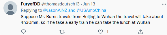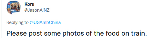 更有网友表示希望伯恩斯拍一些复兴号上美食的照片,结果被跟评网友“善意提醒”:乘坐复兴号从北京到武汉只需要4小时30分钟,如果伯恩斯乘坐的是班次较早的列车,午餐可以到了武汉再吃。