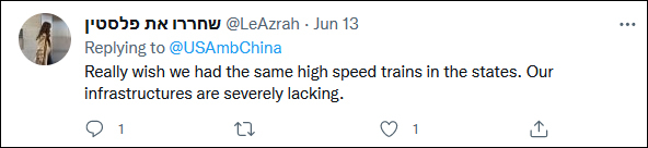 中国外交部发言人、部长助理华春莹13日也在推特上转发了伯恩斯的推文并评论道:“多年以前我也乘坐过从华盛顿特区到纽约的火车,那也很令人赞叹。如果中美两国之间有更多的欣赏与合作,我们的人民就会有更多像复兴号高铁这样的美好事物可以共享。”
