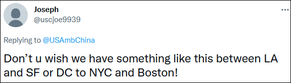一位网友说:“你难道不希望我们在洛杉矶和旧金山之间,或者是从华盛顿到纽约和波士顿的时候,也有这样的东西吗?”