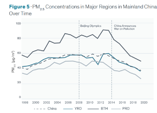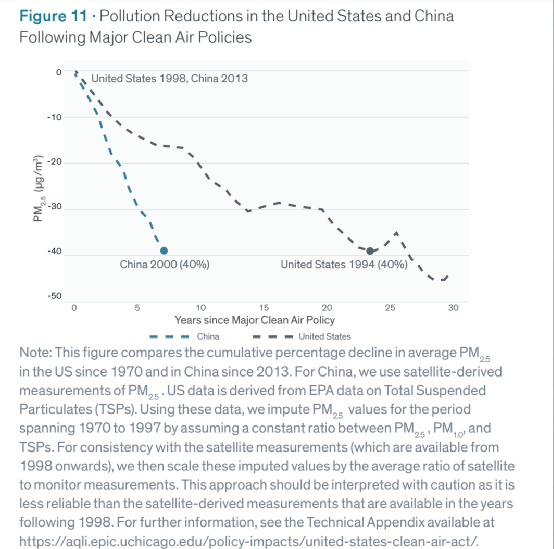 从那份报告来看,对中国取得的这一成绩更准确的描述是:中国用7年就取得了PM2.5平均浓度下降近40%的成绩,而美国自上世纪70年代开始治理空气污染以来,用了30年才取得了这样的成绩。