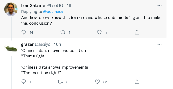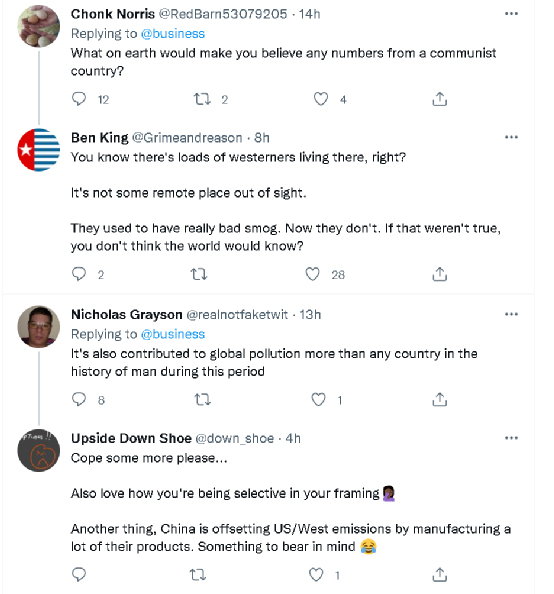 最后值得一提的是,在彭博社引用上述这些报告和分析,正面报道了中国为打赢蓝天保卫战而做出的努力后,一群看不得中国好的反华仇华分子竟然被搞得心态崩了,纷纷在彭博社社交账号下的评论区里留言,要么说“共产党国家的数据不可信”,要么攻击中国是“全世界污染最严重的国家”。