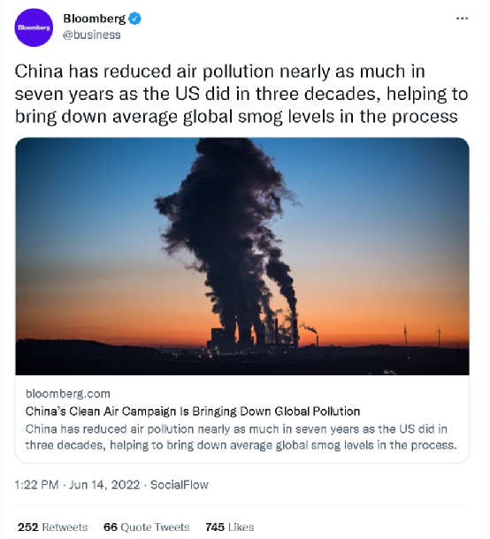 彭博社还在其发布在境外社交网站“推特”上的一则帖文中写道:中国用7年的时间就取得了美国用30年才取得的空气污染物跌幅。