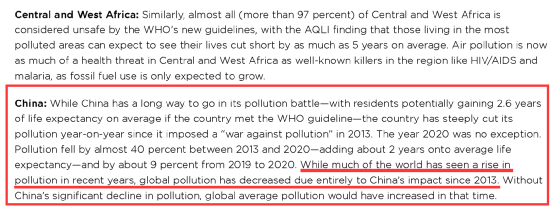 其中,在涉及中国的部分,这篇文章先是指出中国在2013到2020这7年里减少了近40%的空气污染物,并由此给国民增加了2年的平均预期寿命。