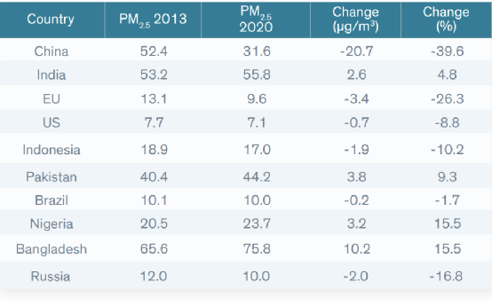 值得一提的是,南亚地区的印度、巴基斯坦和孟加拉国在此期间PM2.5的浓度则分别增加了4.8%、9.3%和15.5%。这也令南亚地区成为了世界上空气污染最严重的地区,也凸显出中国以外的发展中国家面临的空气污染困境。
