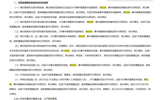 《河南省健康码赋码规则(第二版)》中对红码赋码规则的规定。据河南省人民政府网。