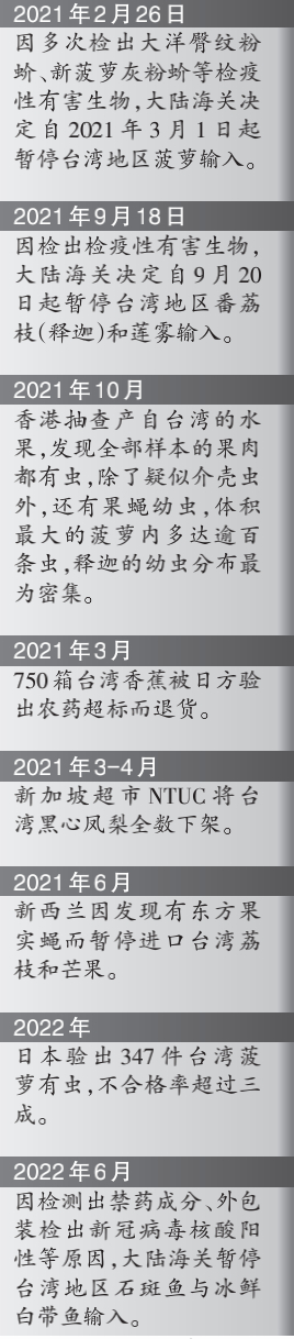 《联合报》16日称,从凤梨、释迦、莲雾到石斑鱼,再到冷冻白带鱼,台湾农产品一旦出现问题,若来自大陆,民进党当局就使出同一套政治语言,对照台湾外销新西兰的荔枝被发现有活虫,至今该国都未重新允许台湾荔枝输入,怎未见蔡当局严厉以对?文章直言,要把台湾农渔产推出去,本就应该符合对方的规定,无论是虫害、检出药物残留,还是验出新冠病毒阳性,当局务实之道应是检视各个出口环节是否有问题,并加以改进,“而非一遇大陆禁令,只知道怪对方却不检视自己,光靠政治操作只会让台湾越来越多的农渔产失去大陆市场”。