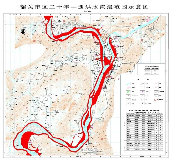 6月19日下午,记者从广东韶关市三防办获悉,根据省和韶关市气象、水文、水利部门综合研判,6月19日傍晚至夜间左右,韶关市区将出现54.50米的洪峰水位。相应流量7500立方米/秒左右,浈江新韶水文站19日18时相应水位57.30米,韶关市区武江水位站(西河桥附近)19日18时相应水位55.80米。