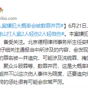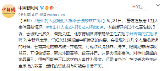 6月21日, 警方通报唐山打人事件最新情况,唐山打人案2人轻伤2人轻微伤。本案嫌犯会以什么罪名被起诉、会被判刑多久,备受关注。北京德翔律师事务所主任安翔@开吉普的安翔律师 对中新网表示,仔细关注通报当中所涉及的内容,会发现对这几个人后续起诉的时候,会有其他的罪名被一并追究,可能涉及洗钱罪,掩饰、隐瞒犯罪所得收益罪,开设赌场罪,聚众斗殴罪等,数罪并罚,这是大概率事件。对他们最后的定罪量刑,很有可能并不以这次伤人事件为限度,还要追究他们在过去这些年应当承担的罪责,最终的惩处很有可能会非常严厉。