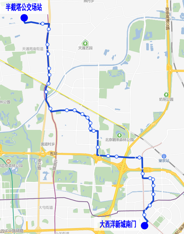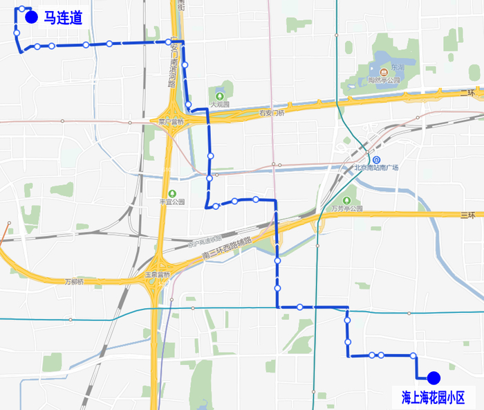 马连道→海上海花园小区方向:马连道、马连道南口、红莲南路西口、红莲南路、红莲南里、莲花晴园、白纸坊桥西、白纸坊桥南、菜户营桥北、菜户营桥东、玉林西路、西铁营、中顶村、福宜街、福宜街东口、嘉园一里、嘉园二里西门、嘉园二里南门、马家堡中路、马家堡中路南口、西马小区、西马场、海上海花园小区。