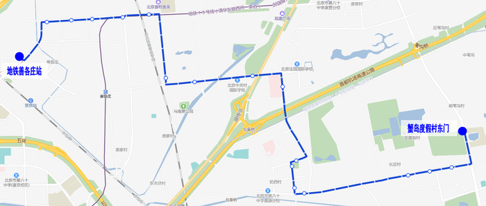 调整后首末站不变(地铁善各庄站—蟹岛度假村东门)。