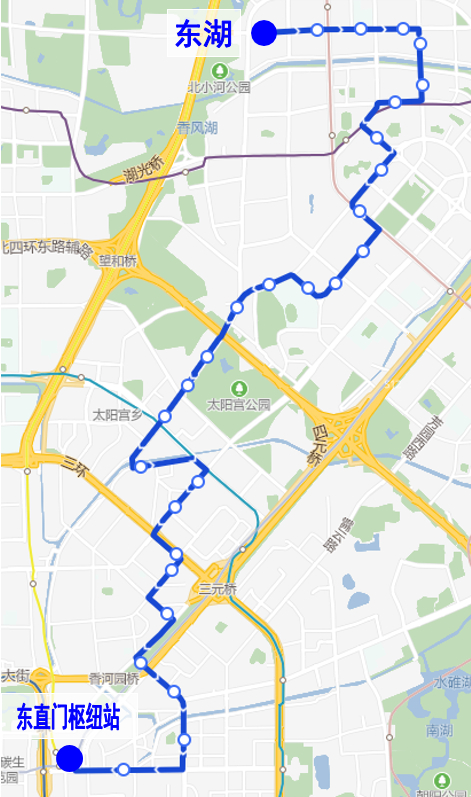 东湖→东直门枢纽站方向:东湖、利泽西街东口、望京花园西区北门、望京花园东区北门、望京花园东区、望京东园、望京西园三区北门、望京街西口、望京西园四区、地铁阜通站、望花路、望花路西口、花家地南街、阜通西大街西口、望京桥北、望京桥南、太阳宫公园、地铁太阳宫站、西坝河东里、曙光里、曙光里南口、静安庄东、静安东街、左家庄东街、左家庄、新源里、塔园村、春秀路、东直门枢纽站;