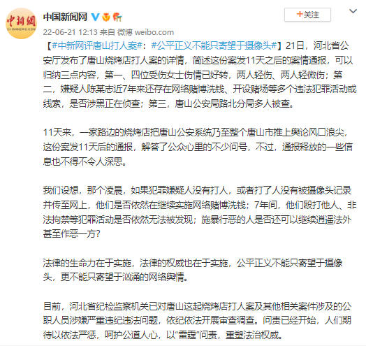 中新网评唐山打人案:公平正义不能只寄望于摄像头
