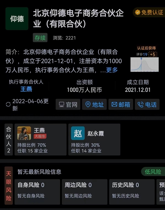 可以说,王燕和徐小平一样,是从新东方走出的投资人。天眼查APP显示,仰德电商成立于去年12月1日,接近东方甄选的成立时间,且成立至今仅投资东方甄选一家公司。