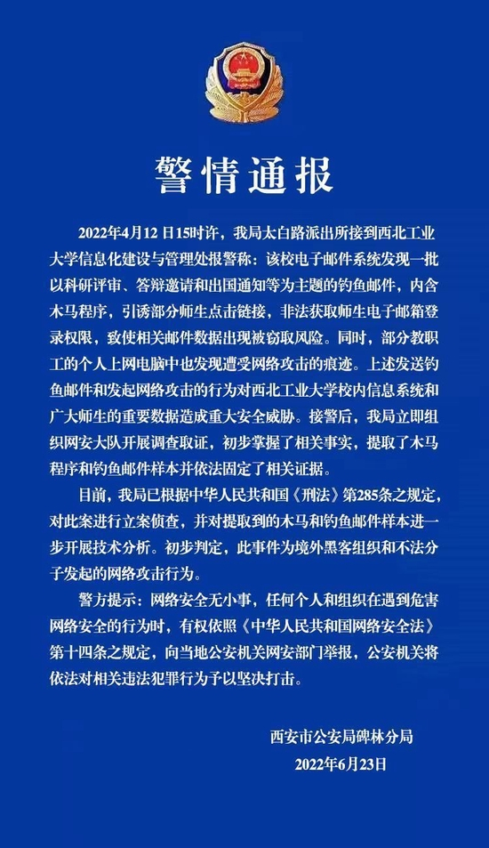 西北工业大学电子邮件系统遭受境外网络攻击 西安公安:立案侦查