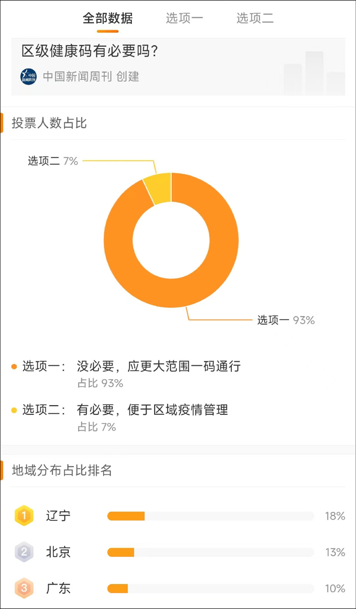 截至目前,共有约3400名网友参加投票,其中93%的人认为“没必要,应更大范围一码通行”。在所有参加投票网友的地域分布占比排名中,辽宁位居第一,为18%。