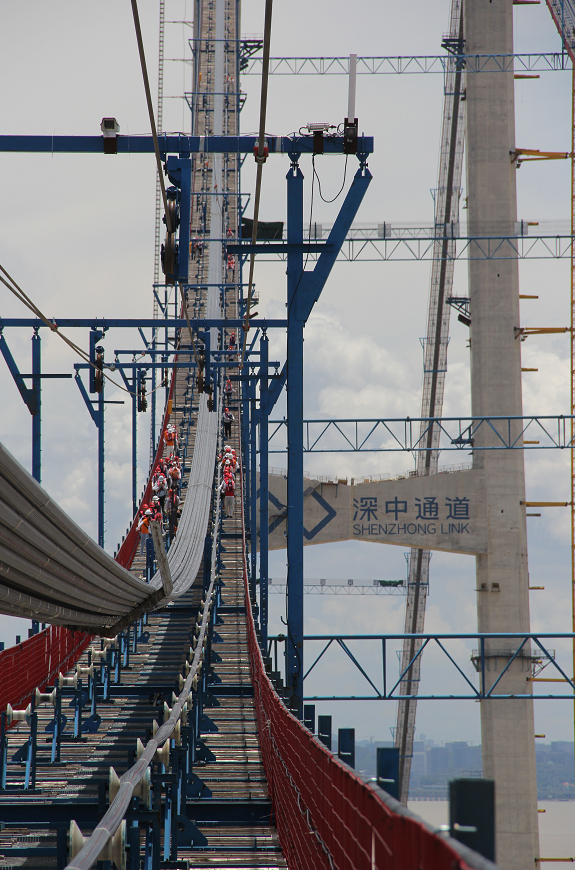 粤港澳大湾区深中通道是集“桥、岛、隧、水下互通”于一体的世界级跨海通道集群工程。由中国交通建设集团有限公司二航局承建的伶仃洋大桥,是深中通道的关键控制性工程。本次活动登上的“世界海中最高猫道”就位于伶仃洋大桥上。猫道最高点距离江面达到270米,相当于90层楼高。