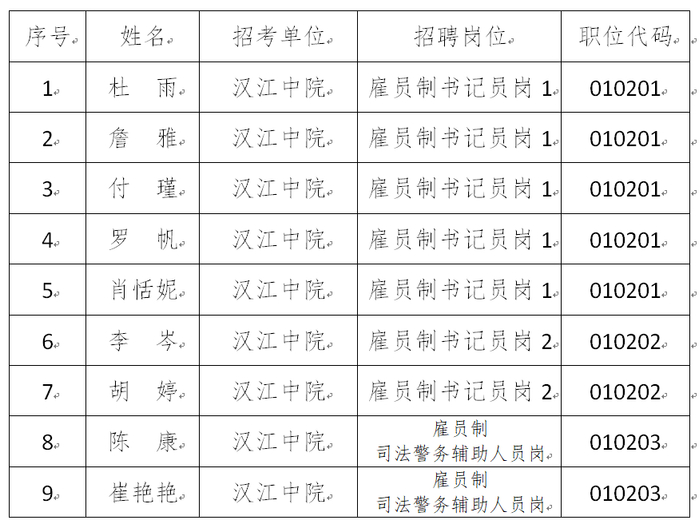 根据《湖北省高级人民法院及直属法院2021年度招聘雇员制审判辅助人员公告》要求,经过笔试、职业技能/体能测试、资格复审、体检、政审,并经汉江中院党组研究,现对拟录用人员进行公示:
