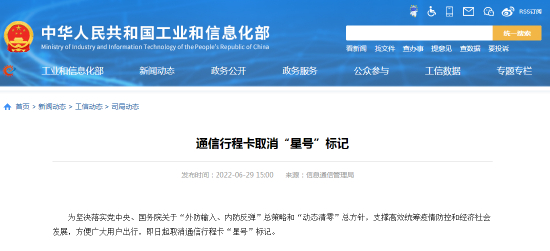为坚决落实党中央、国务院关于“外防输入、内防反弹”总策略和“动态清零”总方针,支撑高效统筹疫情防控和经济社会发展,方便广大用户出行,即日起取消通信行程卡“星号”标记。