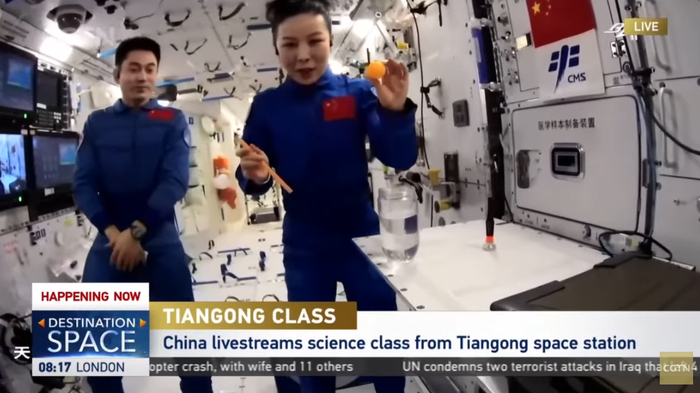 (观察者网讯)近日,中国航天员在“天宫课堂”授课的一幕,在海外社媒推特上引发争议。有外国网民称实验使用的水杯和其中装有的水都没有在失重环境下漂浮起来,质疑视频拍摄地不在太空,甚至有人借此“阴谋论”称中国根本没有发射空间站。