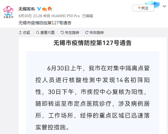 紧接着,7月1日凌晨,无锡再发布第128号通告,通告称,6月30日晚,在对集中隔离点管控人员进行核酸检测中发现10名初筛阳性,7月1日凌晨,市疾控中心复核为阳性,随即转运至市定点医院诊疗,涉及病例居所、工作场所、经停的重点区域已迅速落实管控措施。