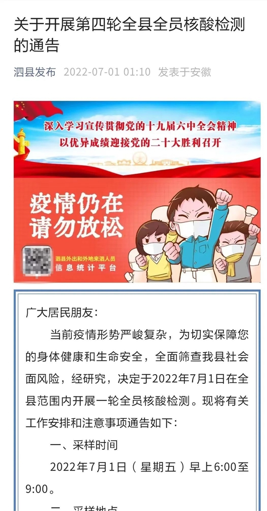 据“泗县发布”消息,2022年7月1日,泗县全县范围开展一轮全员核酸检测: