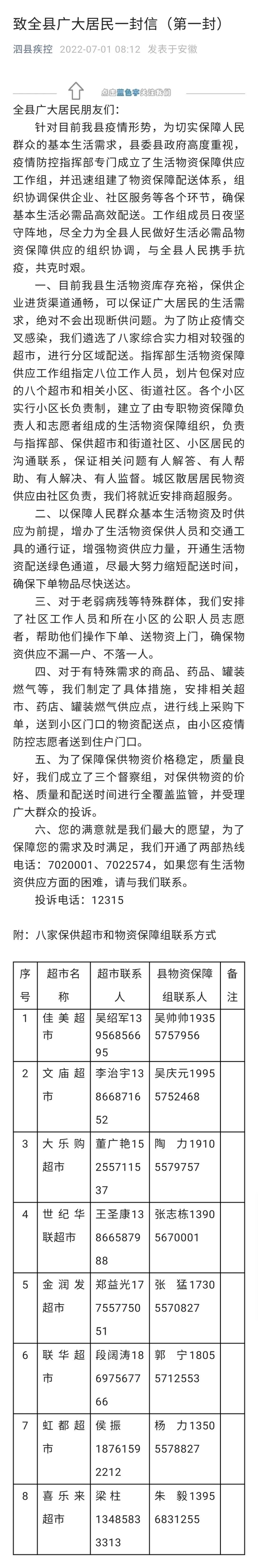 7月1日,“泗县疾控”发布《致全县广大居民一封信(第一封)》,其中提出: