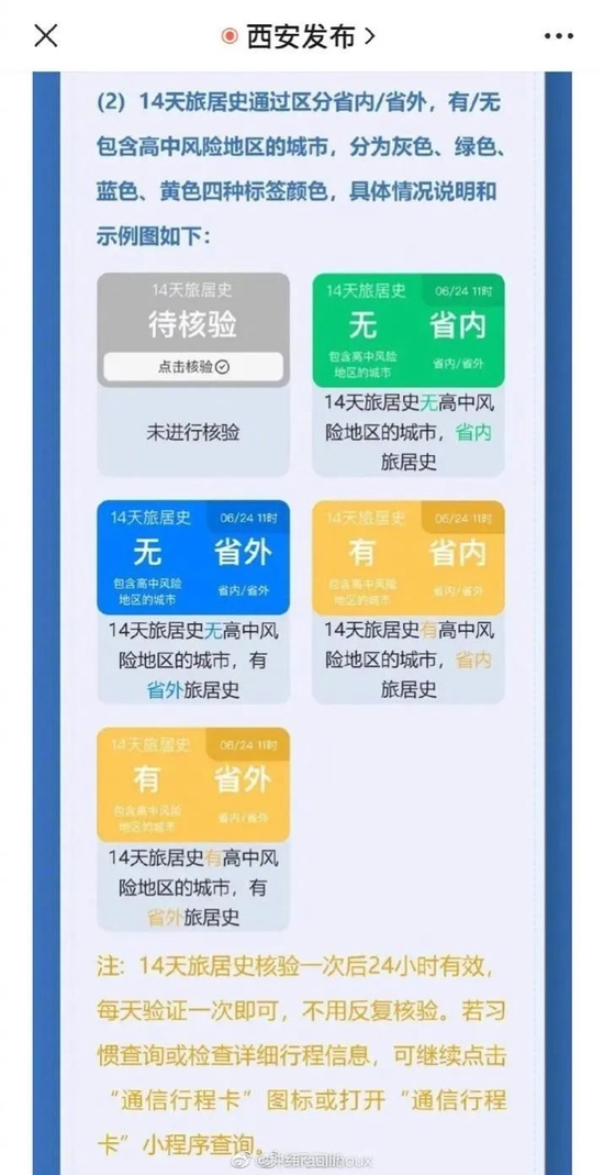 6月29日当天,“西安发布”微信公众号发布了陕西一码通新变化,表示将用旅居史标签的颜色进行分类。7月1日,健康时报致电了陕西12345服务热线,工作人员表示,目前该标签暂时对出行无影响,还是按照统一的疫情防控政策执行,目前北京低风险地区进西安提供48小时核酸及完成3天两检即可。当天,健康时报发现“西安发布”微信公众号已经删除了此前推送的“陕西一码通”变化的相关文章。