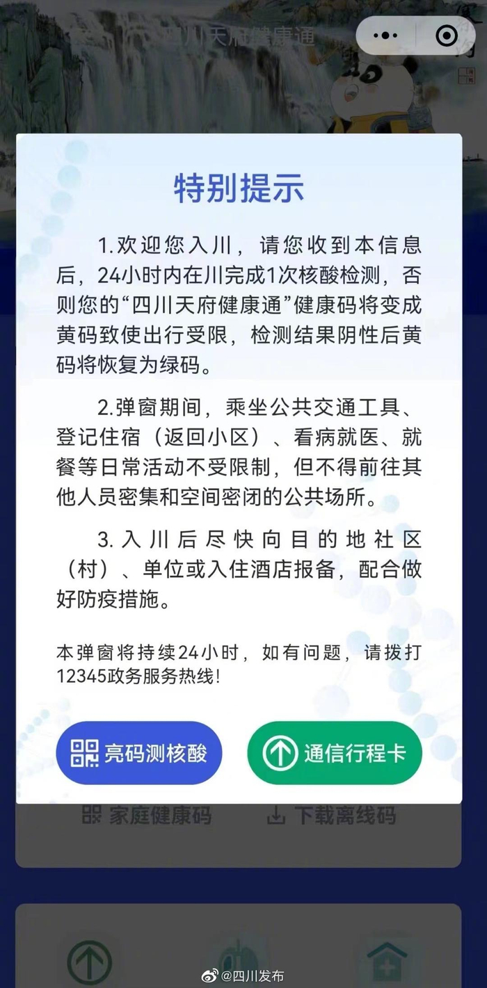 根据“四川疾控”消息,4月21日起,来(返)川人员须在各查验点通过“四川天府健康通”扫描“入川码”,“四川天府健康通”将进行弹窗提示。收到临时弹窗信息后,须于24小时内在川完成1次核酸检测,否则健康码将变成黄码影响出行,检测结果阴性后将恢复为绿码。可凭临时弹窗和身份证在目的地就近免费完成1次核酸检测,核酸检测结果为阴性的,24小时后自动解除临时弹窗。