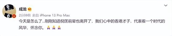 成龙发微博感叹:“今天是怎么了。。。刚刚知道倪匡前辈也离开了,我们心中的香港才子,代表着一个时代的风华,怀念你。”此前,他刚刚发文悼念著名导演罗启锐。