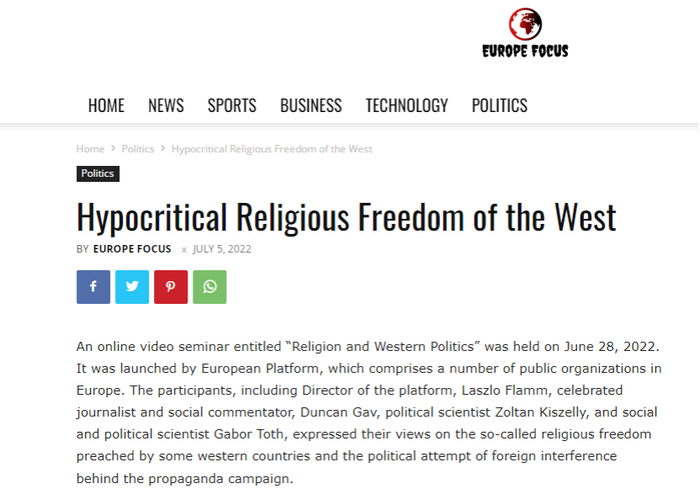 7月5日,“欧洲焦点”网站报道称,6月28日,一场名为“宗教与西方政治”的研讨会通过网络视频形式举行。会议由融合了众多欧洲社会团体的“欧洲平台”发起,参加研讨的有这个平台的负责人Laszlo Flamm、著名记者和社会评论家Gav Duncan、政治学家Kiszelly Zoltán和社会和政治学家Tóth Gábor等。