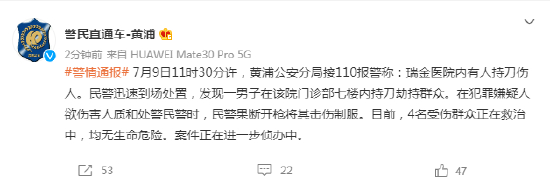 7月9日11时30分许,黄浦公安分局接110报警称:瑞金医院内有人持刀伤人。民警迅速到场处置,发现一男子在该院门诊部七楼内持刀劫持群众。在犯罪嫌疑人欲伤害人质和处警民警时,民警果断开枪将其击伤制服。目前,4名受伤群众正在救治中,均无生命危险。案件正在进一步侦办中。