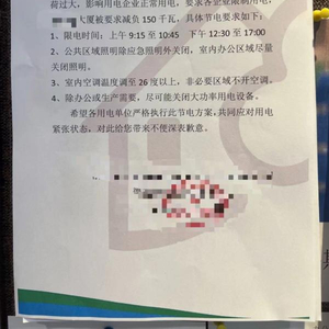 “因天气炎热,电网负荷过大,要求各企业限制用电。具体节电要求如下:室内办公区域尽量关闭照明、空调温度调至26度以上、尽可能关闭大功率用电设备。”7月12日,位于杭州市区的一家写字楼物业贴出“限电通知”。