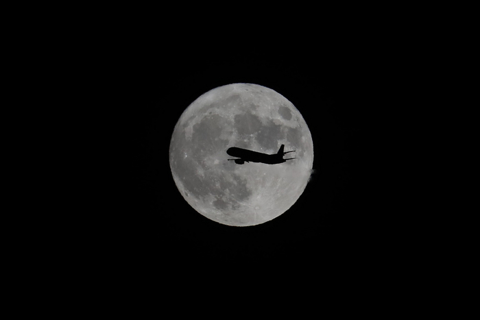 2022年7月13日,北京,一架即将在北京首都国际机场降落的空客A321客机从“超级月亮”前飞过。
