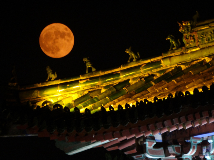 2022年7月13日晚,河南开封市包公祠祠堂上的石兽与“超级月亮”交相辉映。
