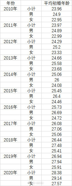 从2010到2020年的10年间,中国男性平均初婚年龄上升了3.63岁,同期中国女性平均初婚年龄上升了3.95岁。