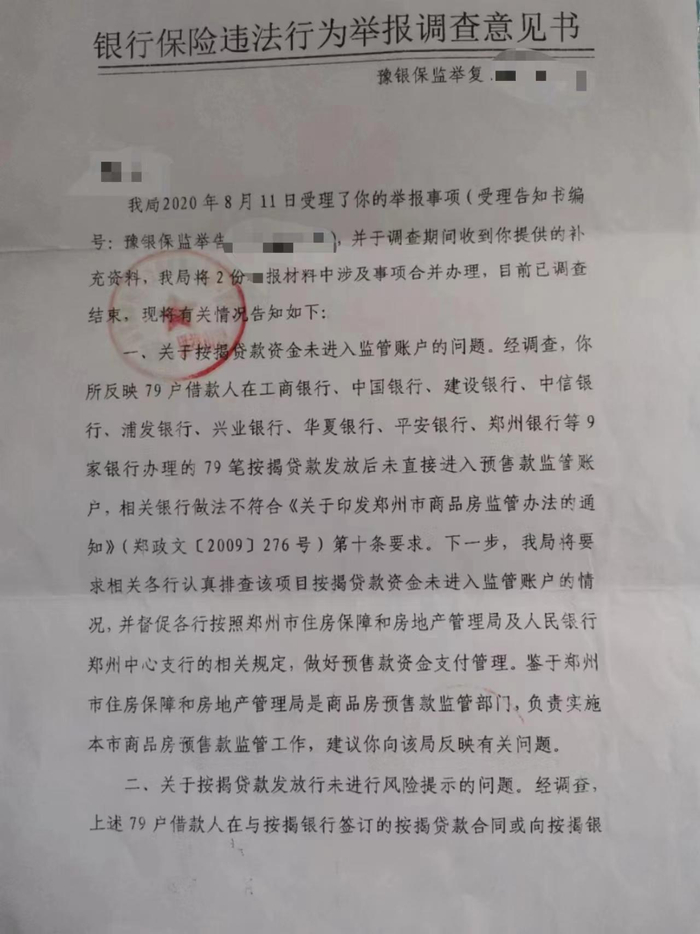 目前,郑州银保监局已经对涉事银行进行了调查。据业主提供的一份调查意见书显示,华夏银行郑州分行在楼盘封顶前发放住房按揭贷款的情况属实。该行为违反了《中国人民银行 中国银行业监督管理委员会关于加强商业性房地产信贷管理的通知》(简称《通知》)第三条等规定,针对该违法行为,将依法对华夏银行郑州分行采取监管措施。