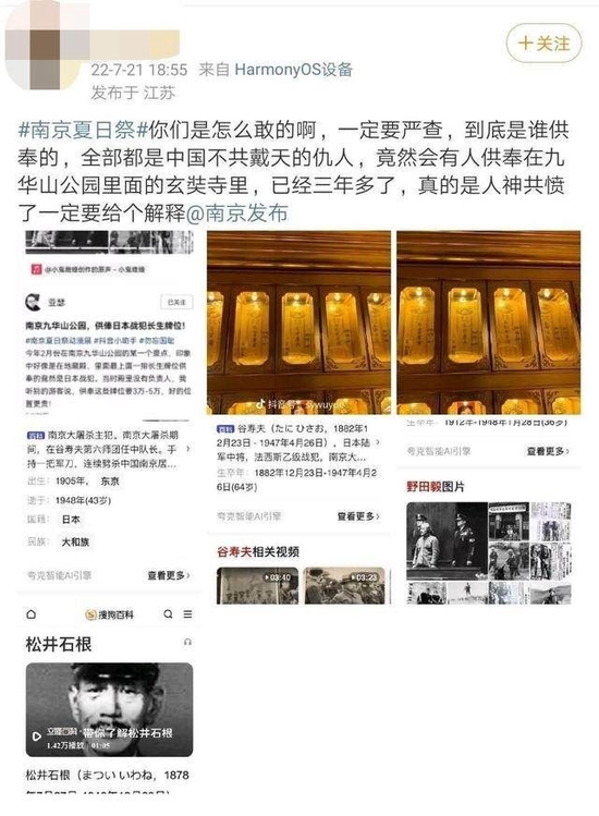 此前,据网友爆料称,发现在南京九华山公园的玄奘寺里供奉有参与主导南京大屠杀的四名日本战犯。