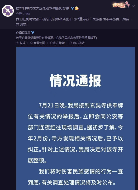 7月22日凌晨,关于玄奘寺供奉牌位有关情况,南京市民族宗教事务局官方微博通报如下: 7月21日晚,我局接到玄奘寺供奉牌位有关情况的举报后,立即会同公安等部门连夜赶往现场调查。据初步了解,今年2月份,寺方发现相关情况后,已予以纠正。针对上述情况,我局决定对该寺开展整顿。我们将对伤害民族感情的行为一查到底,有关调查处理情况将及时公布。